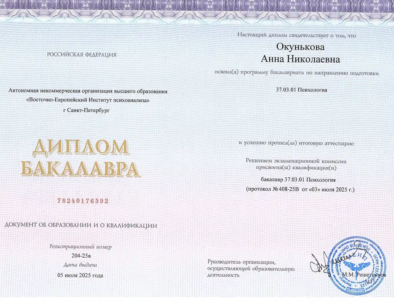 - 2015 - Институт экономики и управления в медицине и социальной сфере ( Диплом о профессиональной переподготовке по программе "Психология. Специализация - Клиническая психология")