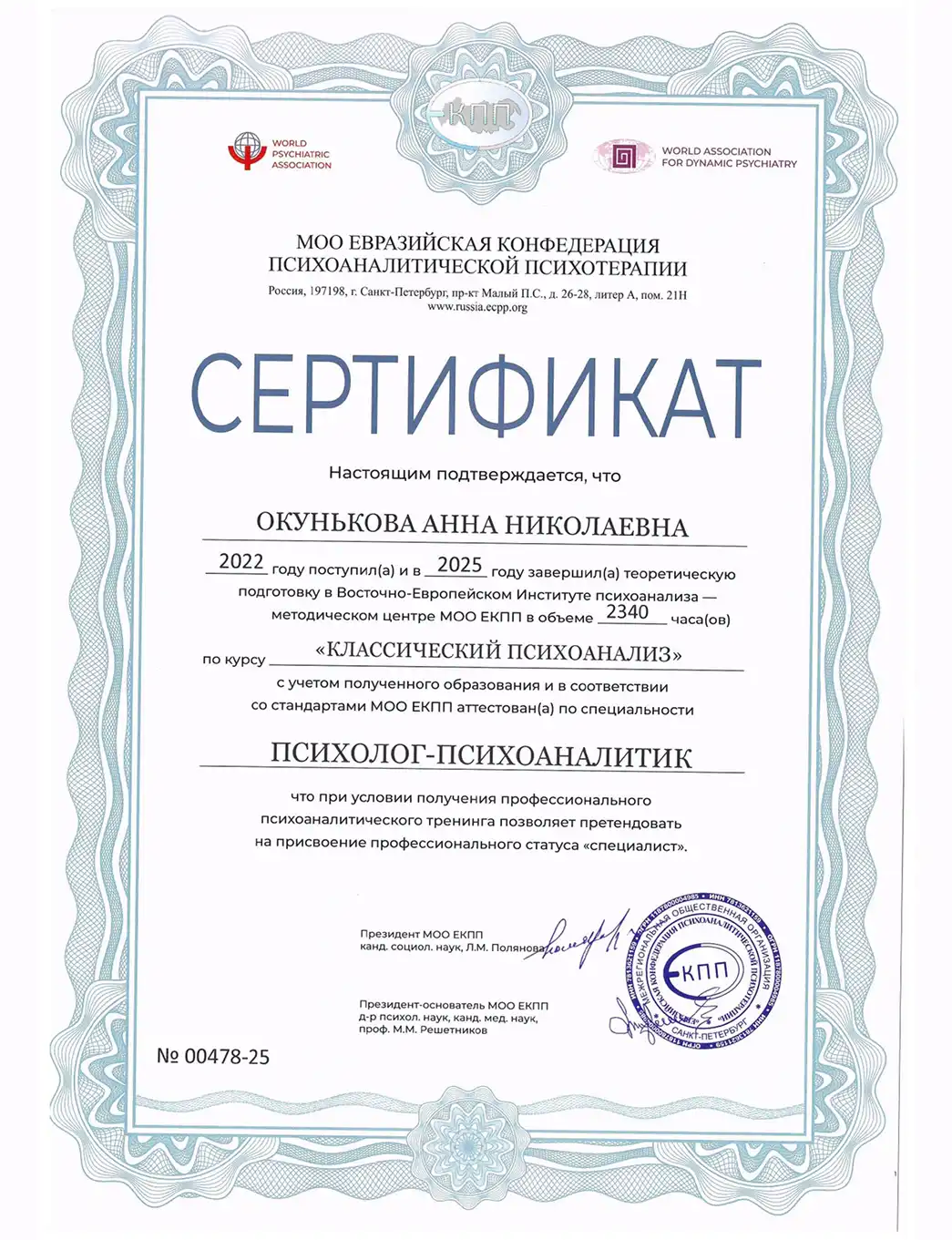 - 2022 - Институт развития человека (Сертификат о прохождении обучения по программе "Эмоционально-образная терапия в работе с психосоматическими проблемами")